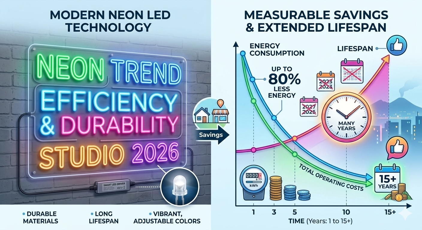 Uno dei motivi principali per cui il Neon LED sta diventando il trend imbattibile è la sua straordinaria efficienza energetica. Consuma fino al 70-80% in meno rispetto al neon tradizionale, traducendosi in un risparmio considerevole sulla bolletta elettrica, un fattore cruciale per le attività commerciali a Napoli. Inoltre, la sua durata è impressionante: parliamo di 50.000-100.000 ore di funzionamento, contro le 10.000-15.000 del neon a gas. Questo significa meno sostituzioni, meno manutenzione e un ROI (Return On Investment) decisamente più rapido.